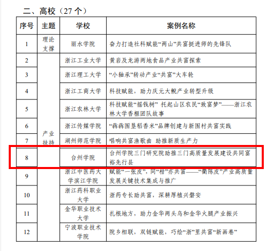 近日,浙江省教育厅公布了2024年教育助力高质量发展建设共同富裕示范区典型案例评选结果,我校报送的《台州学院三门研究院助推三门高质量发展建设共同富 裕先行县》成功入选。
