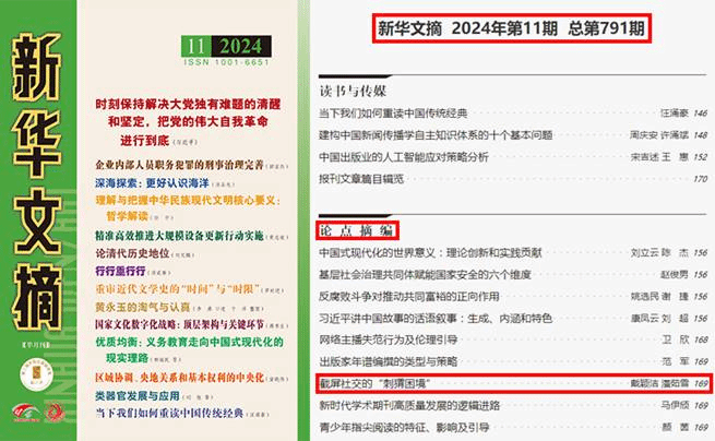 《台州学院学报》2024年第1期刊发的戴颖洁、潘茹雪论文《截屏社交的“刺猬困境”——聊天记录再传播中隐私边界的游移与重塑》,被《新华文摘》2024年第11期以《截屏社交的“刺猬困境”》为题摘录转载。