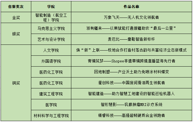 最终,智能制造(航空工程)学院潘迦玮同学负责的《万象飞天——无人机文化领航者》项目荣获金奖,马克思主义学院推荐的王奕天同学负责的《浙有疆来——以果赋能打通援疆助农“最后一公里”》项目和艺术与设计学院郭欢平同学负责的《麦巴比——童鞋智造新标杆》项目荣获银奖。