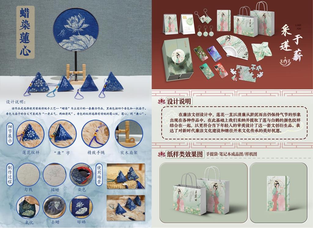 此外,我校选送的五件作品获优秀奖、入围奖。其中《蜡染莲心》《采莲于薪》分获文创类优秀奖与入围奖。《廉洁于我》获海报类优秀奖,《反腐》《导》获海报类入围奖。获奖作品在活动现场进行了集中展出。