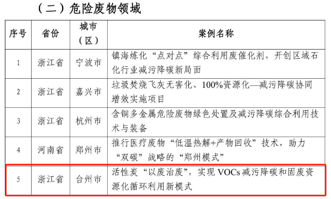 2024年10月,由台州市环境科学设计研究院有限公司负责的《活性炭“以废治废”,实现VOCs减污降碳和固废资源化循环利用新模式》成功入选巴塞尔公约亚太区域中心(以下简称“亚太中心”)2023年“无废城市”减污降碳协同增效典型案例首批推荐名单,全国上榜案例共36个。