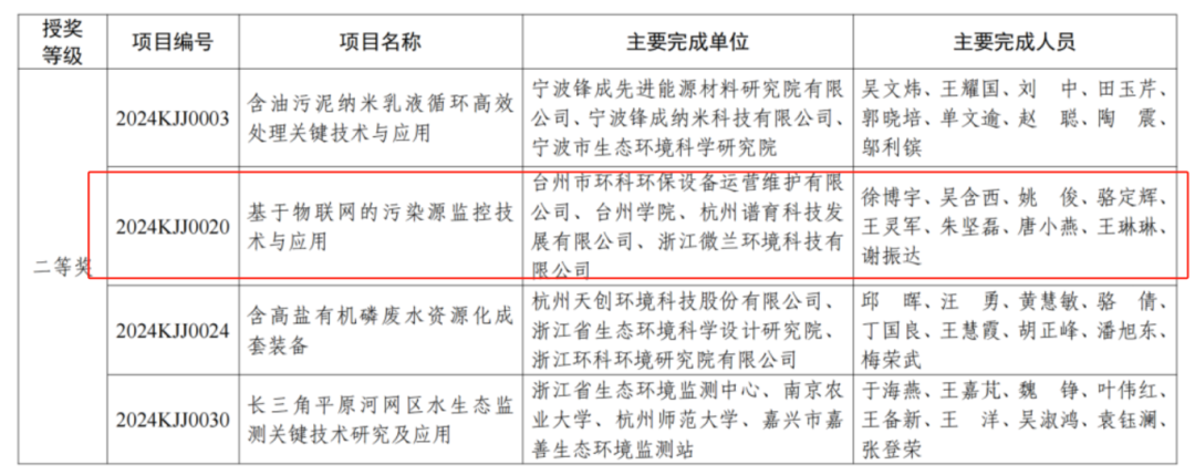近日,浙江省环境科学学会公布了2024年度浙江省生态环境科学技术奖获奖项目名单,台州市环科院有限公司下属子公司台州市环科环保设备运营维护有限公司联合台州学院等单位共同完成的项目《基于物联网的污染源监控技术与应用》荣获二等奖。