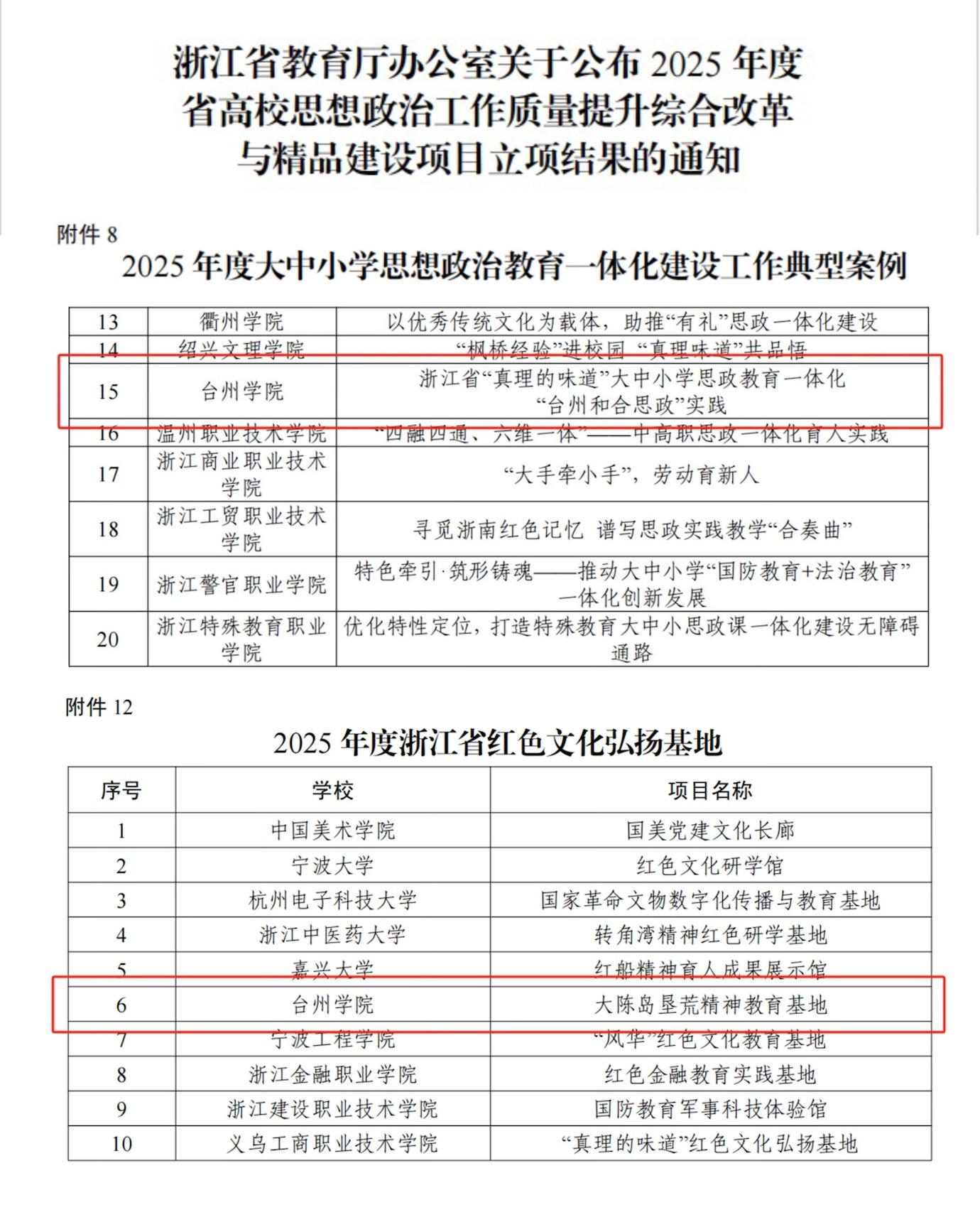 12月2日,省教育厅发布《浙江省教育厅办公室关于公布2025年度省高校思想政治工作质量提升综合改革与精品建设项目立项结果的通知》,我校“大陈岛垦荒精神教育基地”入选“2025年度浙江省红色文化弘扬基地”,“浙江省‘真理的味道’大中小学思政教育一体化‘台州和合思政’实践”入选“2025年度大中小学思想政治教育一体化建设工作典型案例”。