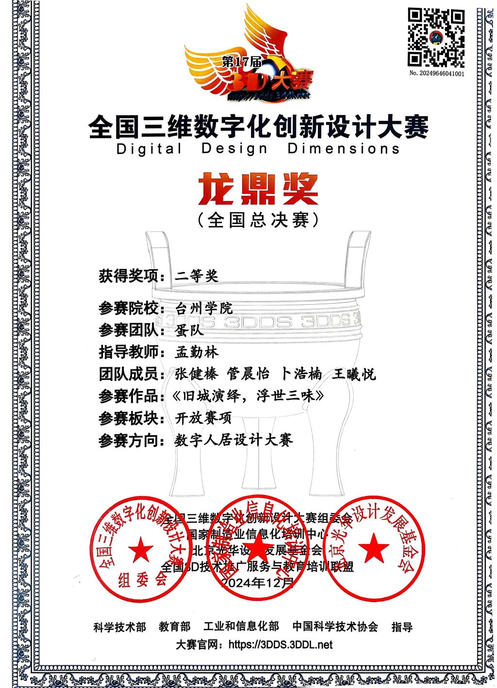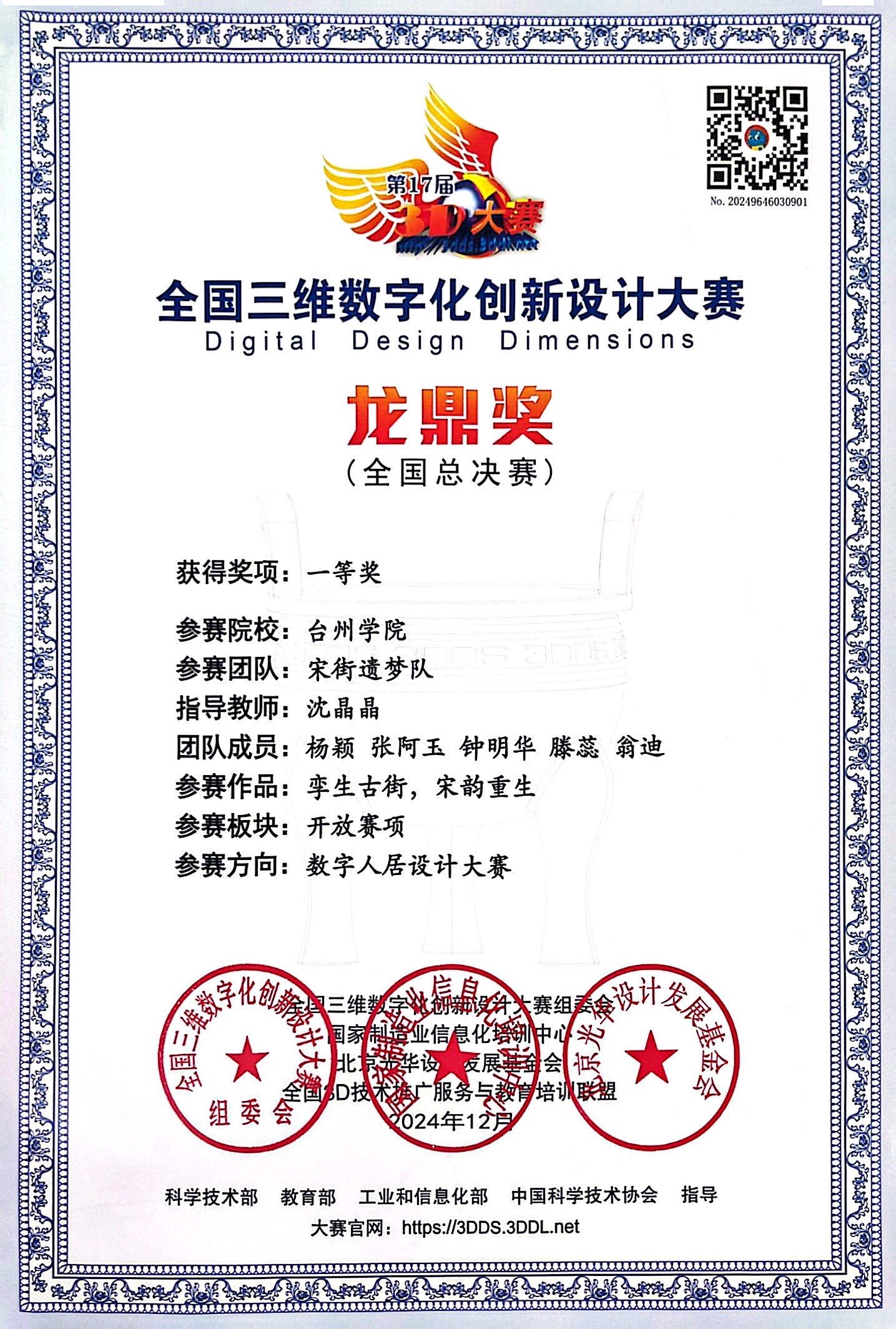 近日,第十七届全国三维数字化创新设计大赛(简称“3D大赛”)年度总决赛榜单正式公布,由沈晶晶指导,杨颖、张阿玉、钟明华、滕蕊、翁迪组成的“宋街遗梦”队,凭借《孪生古街,宋韵重生》获得一等奖。由孟勤林指导,张健榛、管晨怡、卜浩楠、王曦悦组成的“蛋”队,凭借《旧城演绎,浮世三味》斩获二等奖。标志着台州学院在全国3D建模设计领域实力和创新能力的进一步提升。