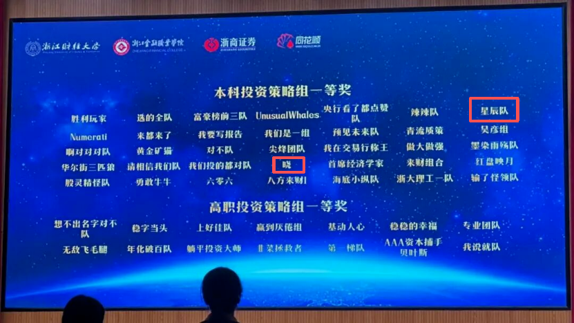 本次比赛,我校从12个学院114支参赛队伍中选拔出25支参加省赛。商学院学子在学院领导的关心支持下,在老师的倾力指导下,怀揣着热情,精心准备,全力以赴。最终,经过多个环节的综合比拼,由蒋俊贤老师指导的星辰队(23金融殷鹏越、24金融专升本冯子昂、24金融张挺恺)和晓(23金融周婉彤、23金融范泽宇、23金融管天乐)获得投资策略组一等奖,由陈力扬老师指导的低调小队(24金融专升本尚佳乐、24金融专升本李巧眉、23金融学厉新涛)获得投资策略组二等奖,由景刚老师指导的光之队(23金融王楠、23财管4班章雨、23国贸3班潘宁静)获得投资策略组二等奖。尤其值得一提的是,星辰队成功挤入全省前十,以全省第7名的成绩获得一等奖;晓队答辩成绩优秀,通过答辩名次前进了17名,获得一等奖,创造商学院学子在答辩环节的最好成绩。