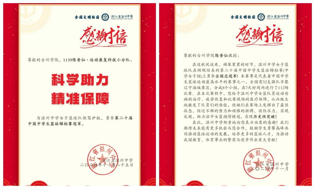 在刚刚结束的第二十届中国中学生篮球锦标赛(中学女子组)上,浙江省温州中学女子篮球队勇夺全国总冠军。在她们捧回奖杯之时,温州中学向我校及陈香仙教授专门发来了感谢信,感谢陈香仙运动康复科技团队在赛程中为女篮队员运动伤病提供了治疗、疲劳恢复和比赛现场的医疗保障,从而极大地激发了队员们的潜能,使她们在赛场上发挥出了最佳状态,并摘得桂冠,实现历史性突破。经过陈香仙治疗的其中两位女篮队员评价说,陈老师能够一眼找到病灶并将其根除,手法非常娴熟,治疗之后整个人都非常放松。