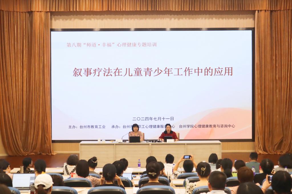为进一步提升全市教职工心理健康工作能力,7月11日至12日,由台州市教育工会主办,台州市教职工心理健康服务中心、台州学院心理健康教育与咨询中心联合承办的第八期“师道·幸福”系列讲座在椒江校区国际会议厅举行。活动特邀清华大学学生心理发展指导中心首席专家李焰教授作“叙事疗法在儿童青少年工作中的应用”为主题的心理健康专题培训,全市200余名教职工参加学习。