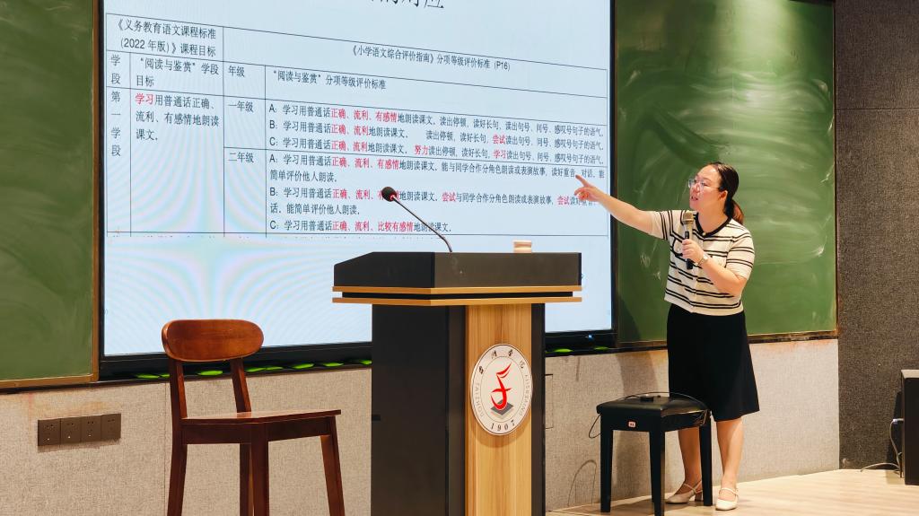10月15日晚,冯玲辉老师为同学们作《统编版小学语文课文朗读教学指导》讲座。冯老师强调了朗读在语文教学中的核心地位,指出朗读是语文学习的基石,也是洞察孩子普通话表达能力的重要窗口。她通过共同朗读《大青树下的小学》,让同学们亲身体验朗读的韵律与情感,并特别强调了停顿、重音的运用,鼓励将情感和动作融入朗读。此外,冯老师还系统讲解了朗读技巧,深入分析了课程标准对朗读的要求,并结合课文序列详细阐述了朗读的注意事项和技巧,让同学们深刻领悟朗读的精髓。