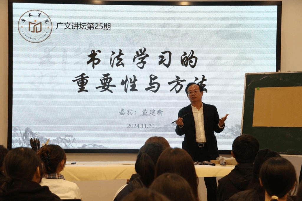 11月20日晚,广文书院在多功能厅举办第25期广文讲坛。浙江财经大学教授、博士生导师,中国书法家协会教育委员会委员黄建新教授,应邀做“书法学习的重要性与方法”专题讲座。广文书院副院长金旭球出席,广文书院学生近60人参加。