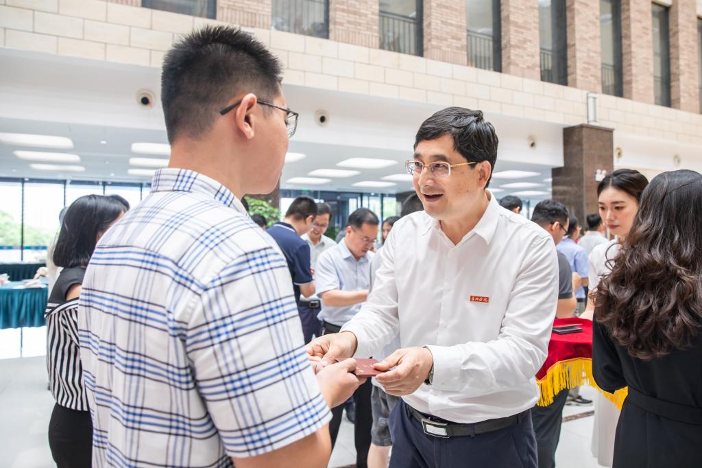 台州学院党政领导班子成员与新教师一一握手并致以亲切问候,同时为他们发放校徽和工作证。