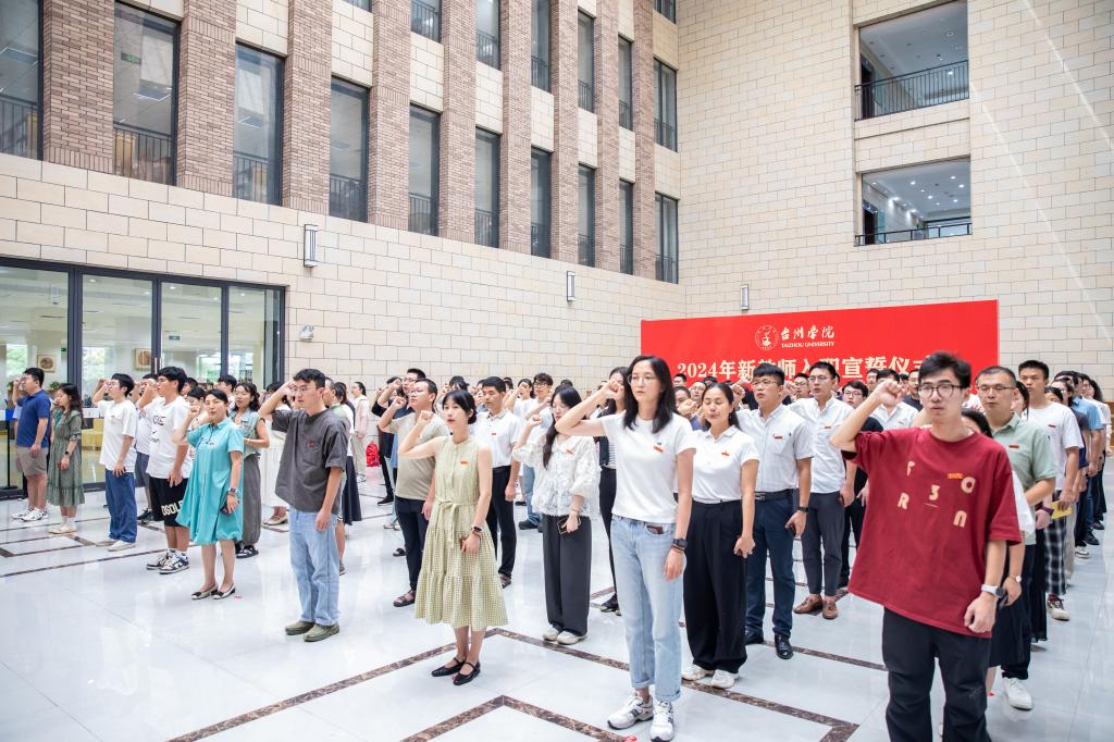 “我志愿成为一名人民教师,忠诚党的教育事业……”9月9日上午,台州学院2024年新教师入职宣誓仪式在椒江校区图书馆举行。110余名新教师高举右手,庄严宣誓。校党委书记朱坚,校长、党委副书记乐传永,党委委员、纪委书记楼胆群,副校长韩得满,党委副书记项凤日,副校长、党委委员李建军,党委副书记丁一志,党委委员、宣传部部长蔡海江出席仪式。仪式由副校长、党委委员李钧敏主持。