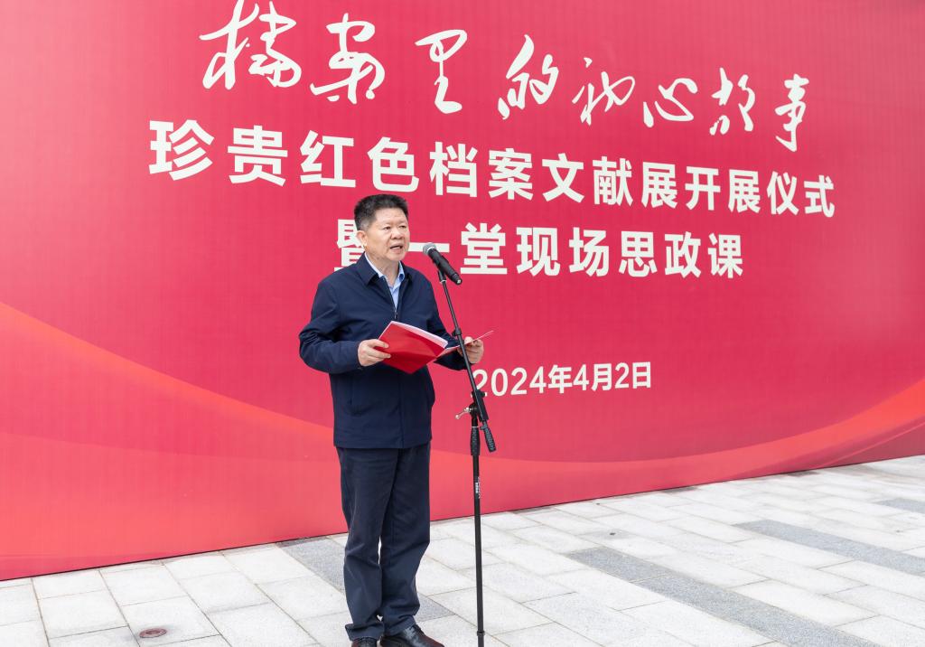 朱坚为活动致辞。他表示,“档案里的初心故事——珍贵红色档案文献展”展馆的落成,是增强党史工作思想引领力、教育感召力、咨政服务力的有力举措,是践行“澡身浴德 修业及时”校训精神的生动实践,更是学校拓展思想政治教育新阵地的不懈探索。对于下阶段的工作,他强调要充分发挥展馆群一体化育人实效,将红色展馆打造成学生思政课现场教学的重要阵地并实现全覆盖,创造性地把红色资源转化为思政教育资源。要抓好讲解员队伍建设,让讲解员不仅讲好中华民族、中国共产党、中华人民共和国、中国特色社会主义的大故事,也要讲好浙江故事、台州故事、台州学院故事,推动全校红色文化学习走深走实。要持续扩大红色文化的社会辐射力,不断加强地方文化研究阐释,聚焦科研平台建设,加强高层次宣传文化人才引育,以先进文化力支撑高质量发展之路,推动精品文化向地方辐射。