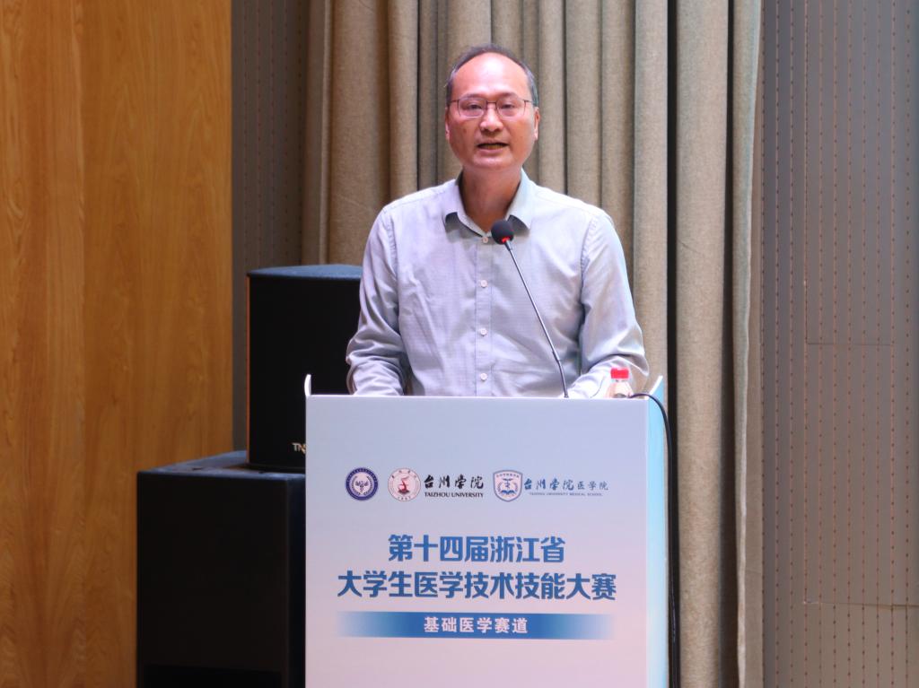 温州医科大学教务处处长李章平致辞,他代表大赛秘书处单位感谢台州学院为赛事准备的付出,强调大赛是一项集专业技能、思维能力、人文素养为一体的综合能力大比拼。基础医学是医学高等教育的重要组成部分,基础医学赛道的比赛旨在进一步推动我省基础医学实践教学的改革、创新实践教育体系、加强基础医学师资队伍建设、全面提升基础医学生综合素质的人才培养质量,以培养具有广博专业知识,突出创新能力的基础医学研究型的拔尖人才。参赛选手们须注重学习与实践的结合,才能在竞赛中成就自我。
