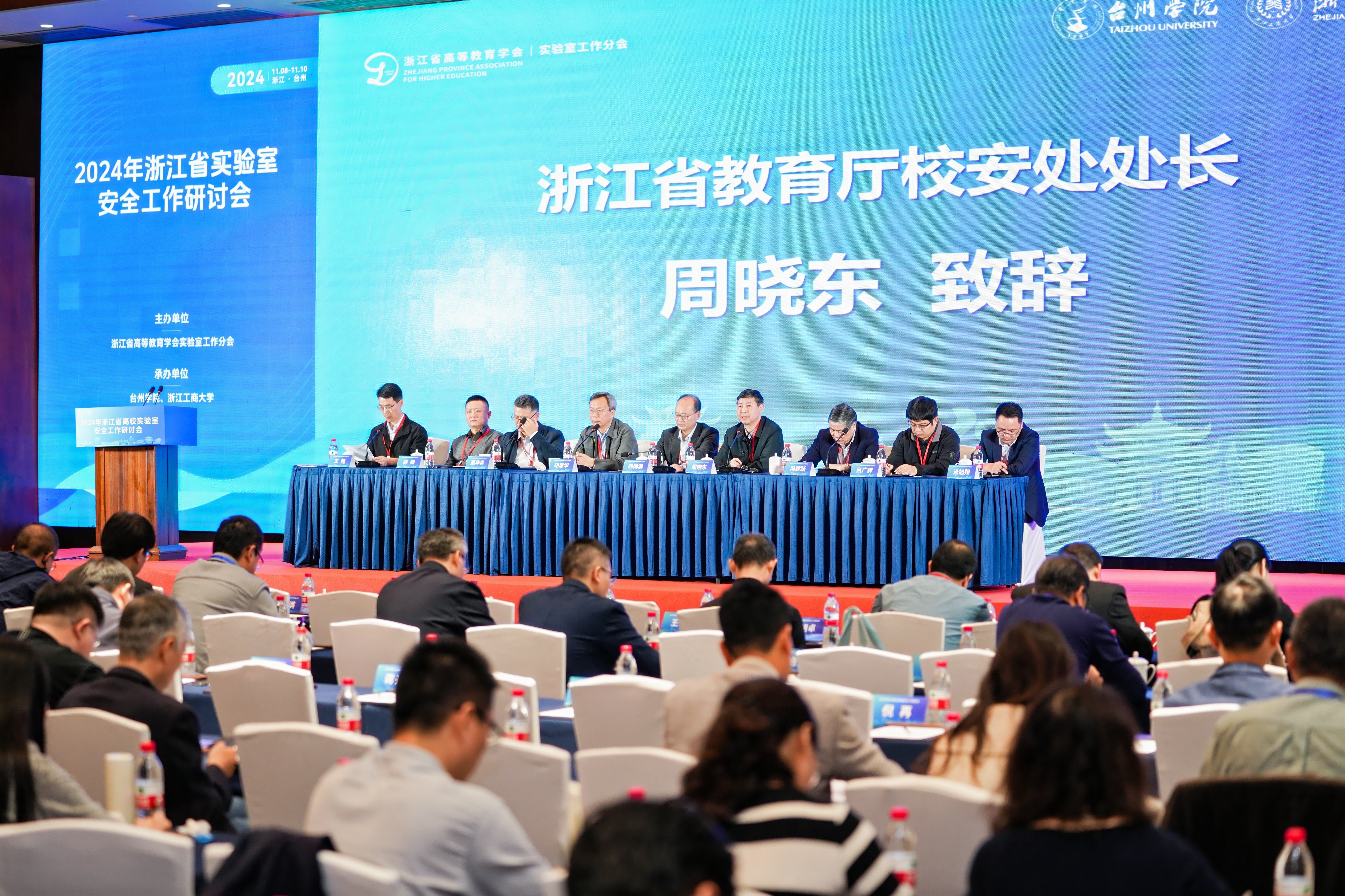 为全面贯彻落实总体国家安全观,切实以高水平安全保障高质量发展,更好统筹构建教育领域新发展格局和新安全格局,提升实验室的体系化建设与智能化治理能力水平,11月8日至10日,由浙江省高等教育学会实验室工作分会主办,台州学院、浙江工商大学联合承办的2024年浙江省高校实验室安全工作研讨会在台州顺利举办。浙江省教育厅校园安全处处长周晓东出席会议并讲话。台州学院副校长韩得满参加会议。