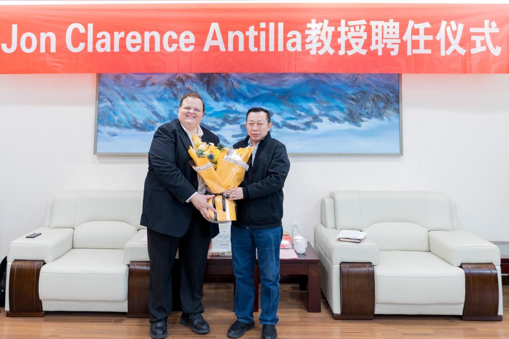 校长、党委副书记乐传永为Jon Clarence Antilla教授颁发聘书并送上鲜花