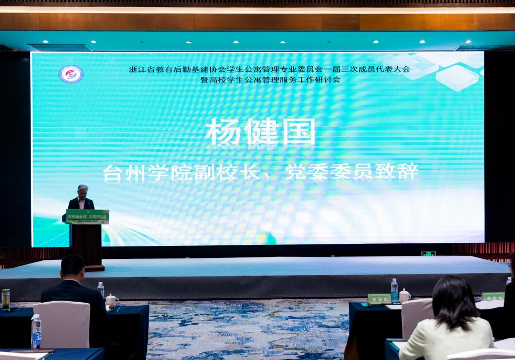 杨健国代表学校致欢迎辞,着重向与会者介绍了学校笃定打造“最关爱学生的大学”,在学生公寓管理服务方面的系列举措。杨健国表示,台州学院作为本次大会的承办单位,将全力以赴为大会的顺利举行提供优质服务,同时也将借此机会与各位同仁共享经验、共破难题,构建更加精准高效的管理服务体系,共同推动全省高校学生公寓高质量发展。