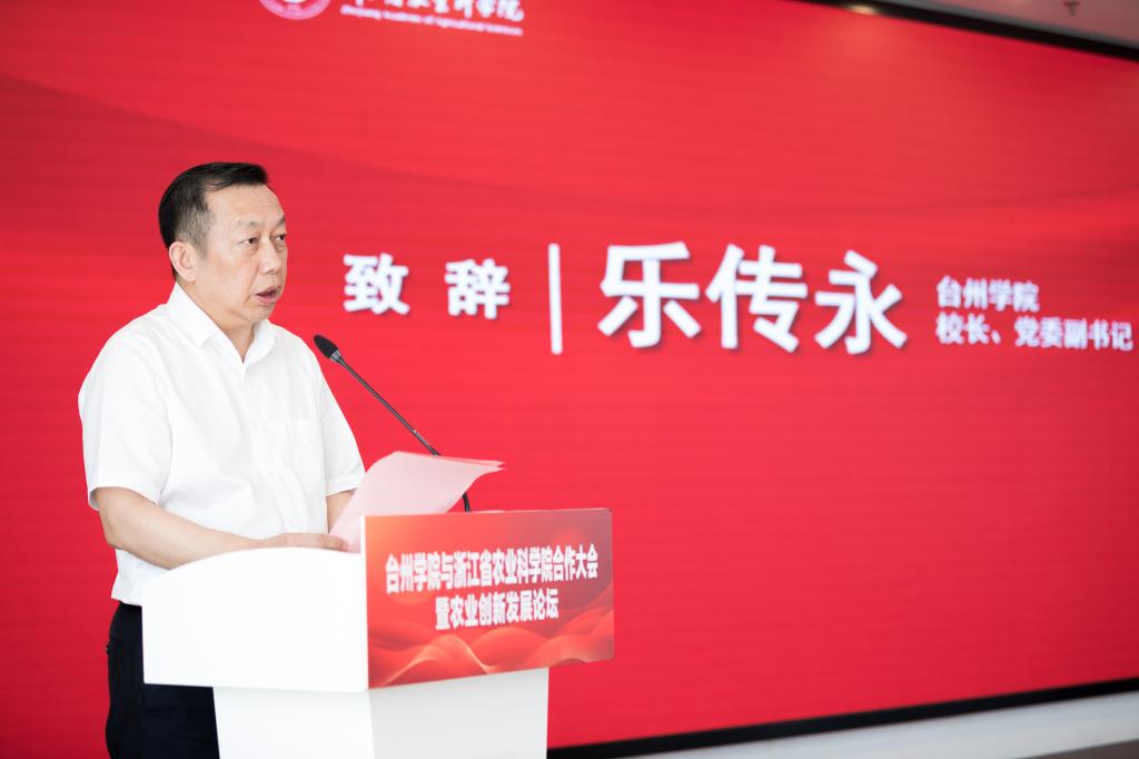 乐传永在致辞中指出,台州学院与浙江省农业科学院合作是落实省委省政府“科技强农”战略的一个重要举措,更是校院双方深化产教融合、服务乡村振兴的一个里程碑,必将加速台州农业科技成果转化,更好助力农业产业提质增效。乐传永希望,双方能深化合作,共担时代使命;优势互补,谱写创新篇章,推动科研成果转化应用于柑橘、茶叶、水产等地方特色农业产业,打造“实验室创新”与“田间应用”深度融合的典范;携手并进,共创美好未来,以本次合作为契机,主动探索高校与科研院所融合发展新机制,形成一批标志性成果,培养一批农业新质人才,落地一批应用转化项目,共同为台州农业农村现代化和乡村振兴作出更大贡献。