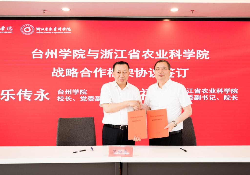 一湾永宁江,两岸橘花香。5月22日,台州学院与浙江省农业科学院合作大会暨农业创新发展论坛在台州学院椒江校区举办。台州市副市长杨玲玲出席会议并讲话,台州学院校长、党委副书记乐传永与浙江省农业科学院党委副书记、院长林福呈共同签订战略合作框架协议。台州学院副校长、党委委员李钧敏主持会议。台州市农业农村局党组成员、副局长曹洁华,台州学院党委委员、人事处处长郑丽君参会。