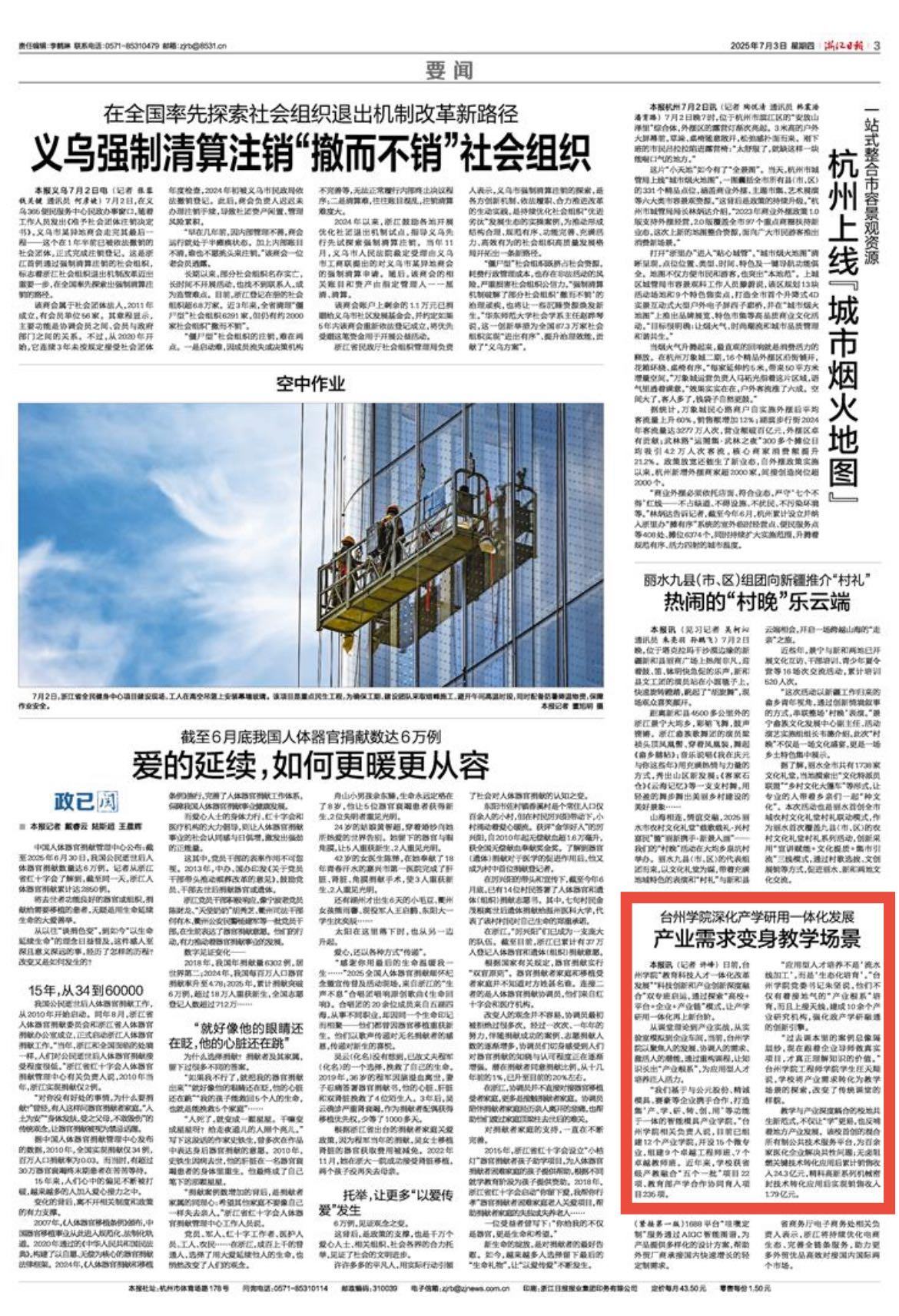 7月3日,《浙江日报》“要闻”版面以《台州学院深化产学研用一体化发展 产业需求变身教学场景》为题,深度报道了我校如何通过紧密对接地方产业需求,创新教学模式,实现教育与产业深度融合的创新工作,充分展现了学校在产学研用一体化发展道路上的积极探索和实践成果。现将全文转载如下:
