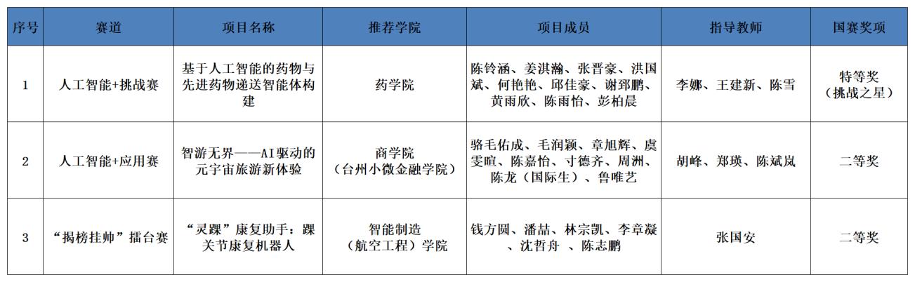 台州学院2025年“挑战杯”国赛项目获奖信息