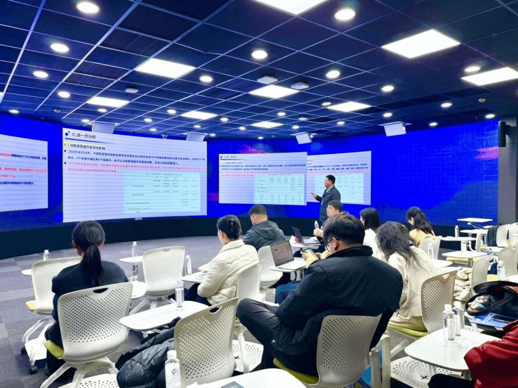 开幕式结束后,浙江省商务研究院副院长刘玲主持主旨演讲环节。浙江省国际经济贸易学会会长马述忠从供给侧、需求侧及供需互动三个维度系统梳理产业集聚理论演进,重点分析数字贸易背景下虚拟空间与地理空间交叠、平台机制与消费者行为变化对产业集聚逻辑的重塑,并前瞻性探讨未来研究方向,为构建中国数字贸易自主知识体系提供重要参考。中国信息经济学会常务副理事长、中山大学管理学院教授肖静华系统阐述案例研究在理解前沿实践、推动理论创新和促进产教研融合中的独特价值,并结合中国企业数字化转型实例,深入讲解高质量案例研究的方法路径,为提升数字经济领域研究与教学水平提供清晰指引。云南财经大学经济学院名誉院长陈昆亭教授从工业化经济“倒V型”长周期规律出发,剖析需求约束、财富结构分化和产业演化对增长周期的影响机制,通过理论模型与动态模拟,为把握中国式现代化背景下实现长期可持续增长的政策方向提供重要支撑。复旦大学田素华基于人均GDP的均值—方差分解构建市场质量测度指标,深入分析中国市场质量的区域差异、国际比较及其与高质量发展的关系,为科学评估市场发展水平、推进强大国内市场建设提供量化工具和政策启示。浙江省商务研究院副院长江玮系统阐释服务业制度型开放的战略意义与国家综合试点进展,并就规则对接、要素流动、监管重构等关键领域提出浙江扩大服务业开放的具体路径,为把握国家试点机遇、引领高能级开放强省建设提供实践参考。段文奇针对企业出海面临的合作不精准、协同效率低等痛点,展示了AI技术在跨境贸易与投资全流程中的赋能机制,提出通过智能推荐、自动化流程和自进化决策构建零成本创业模式,为降低企业出海门槛、提升开放型经济运行效率提供创新范式。
