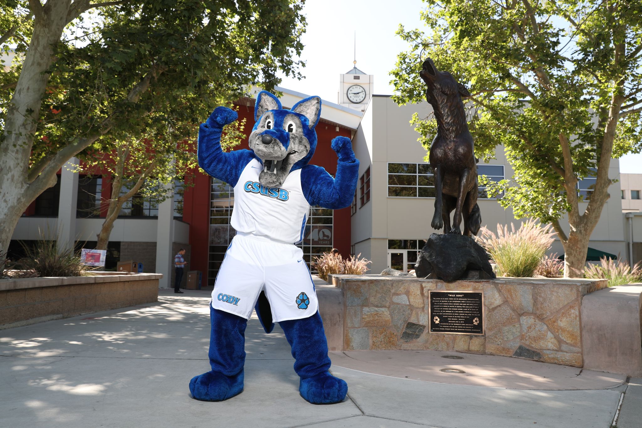 美国加州州立大学圣伯纳迪诺分校官方吉祥物Cody(左)与郊狼雕塑(右)