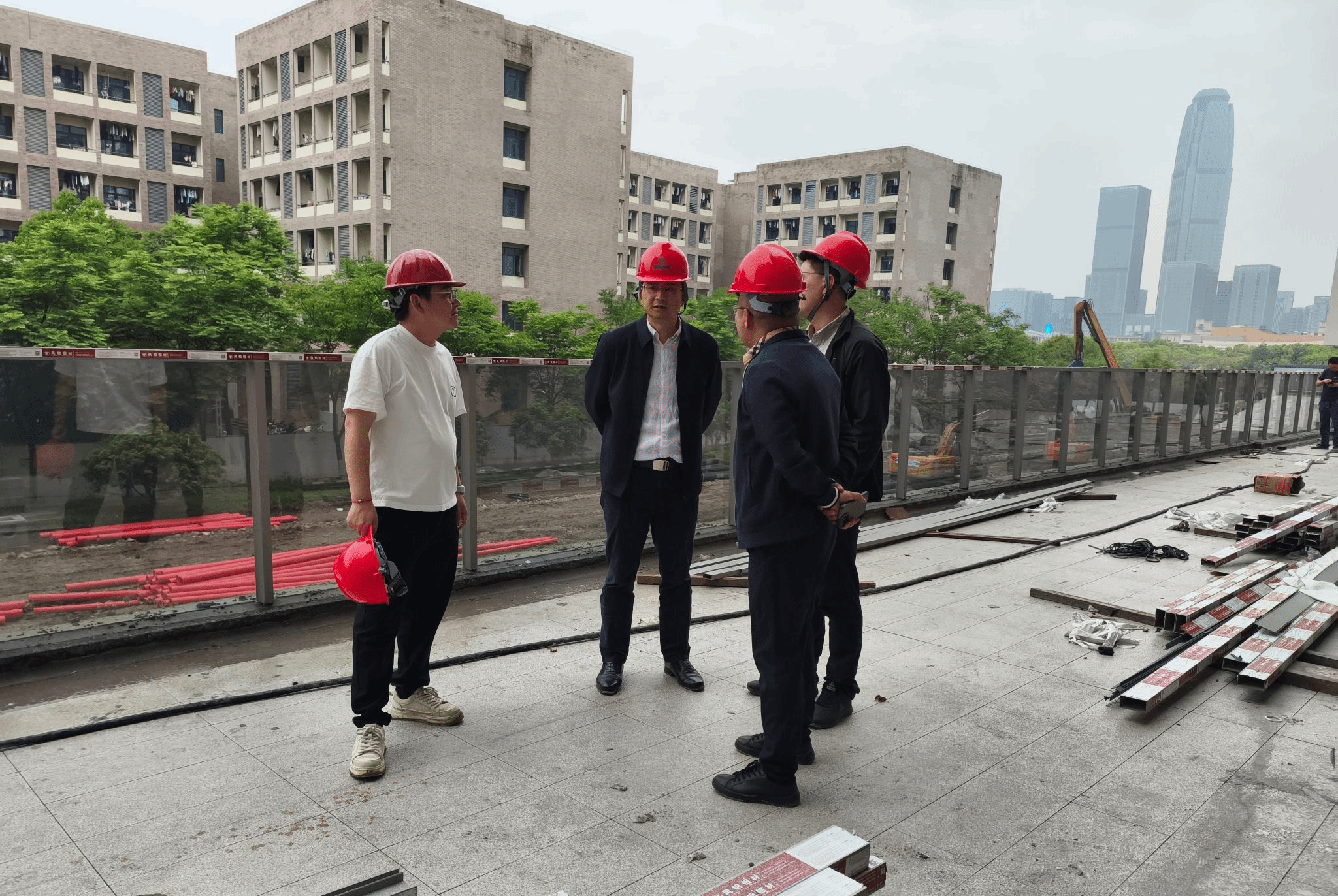 在研究生公寓施工现场,朱坚逐层逐间察看学生宿舍建设情况。他指出,优质舒适的公寓环境直接关系到学生的身心健康、学习效率与成长成才。要从严把控电梯、空调等核心设备的遴选与安装全流程,坚决杜绝质量隐患,确保设备运行安全稳定、使用便捷高效;同时要提前谋划投用后的运维管理模式,为学生提供持续可靠的服务保障。要紧密结合当前学生实际需求,进一步科学优化一层公共空间、二层户外平台等区域的功能布局,合理设置学习研讨、自助服务、休闲社交等功能分区,着力将公寓楼打造为集生活、学习、交流于一体的“一站式”学生社区。要持续发扬“钉钉子”精神,加强与市、区两级相关部门的沟通协调,加快推进高压线迁改工程落地,消除校园周边安全隐患,为学生营造安全、健康、和谐的学习生活环境。
